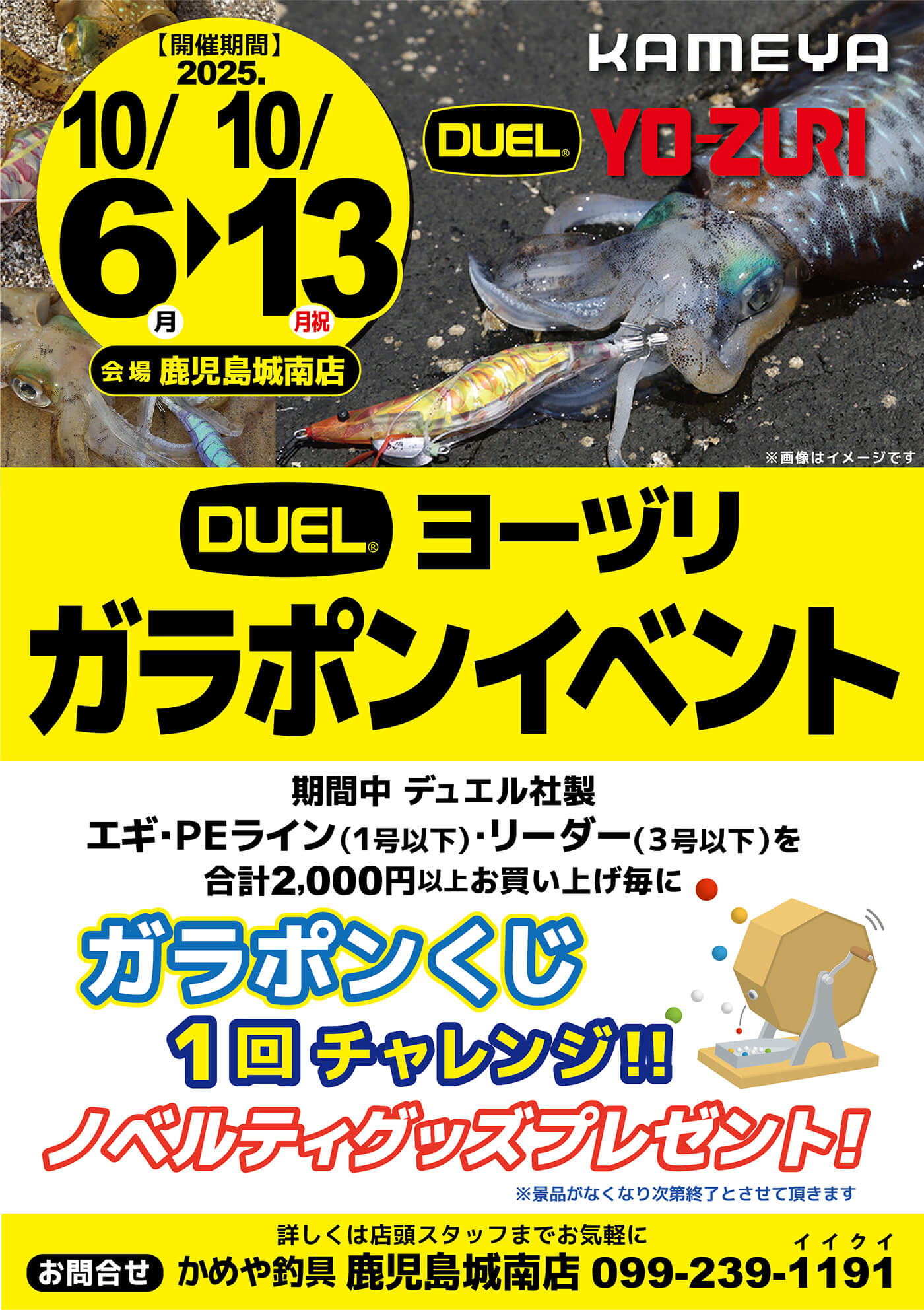 10月062025 【鹿児島城南店】デュエル/ヨーヅリ ガラポンイベント イベント 開催期間 10月6日(月曜日)〜10月13日(月曜日) 開催場所 かめや釣具 鹿児島城南店 参加費 ー 問い合わせ 鹿児島城南店 TEL.099-239-1191
