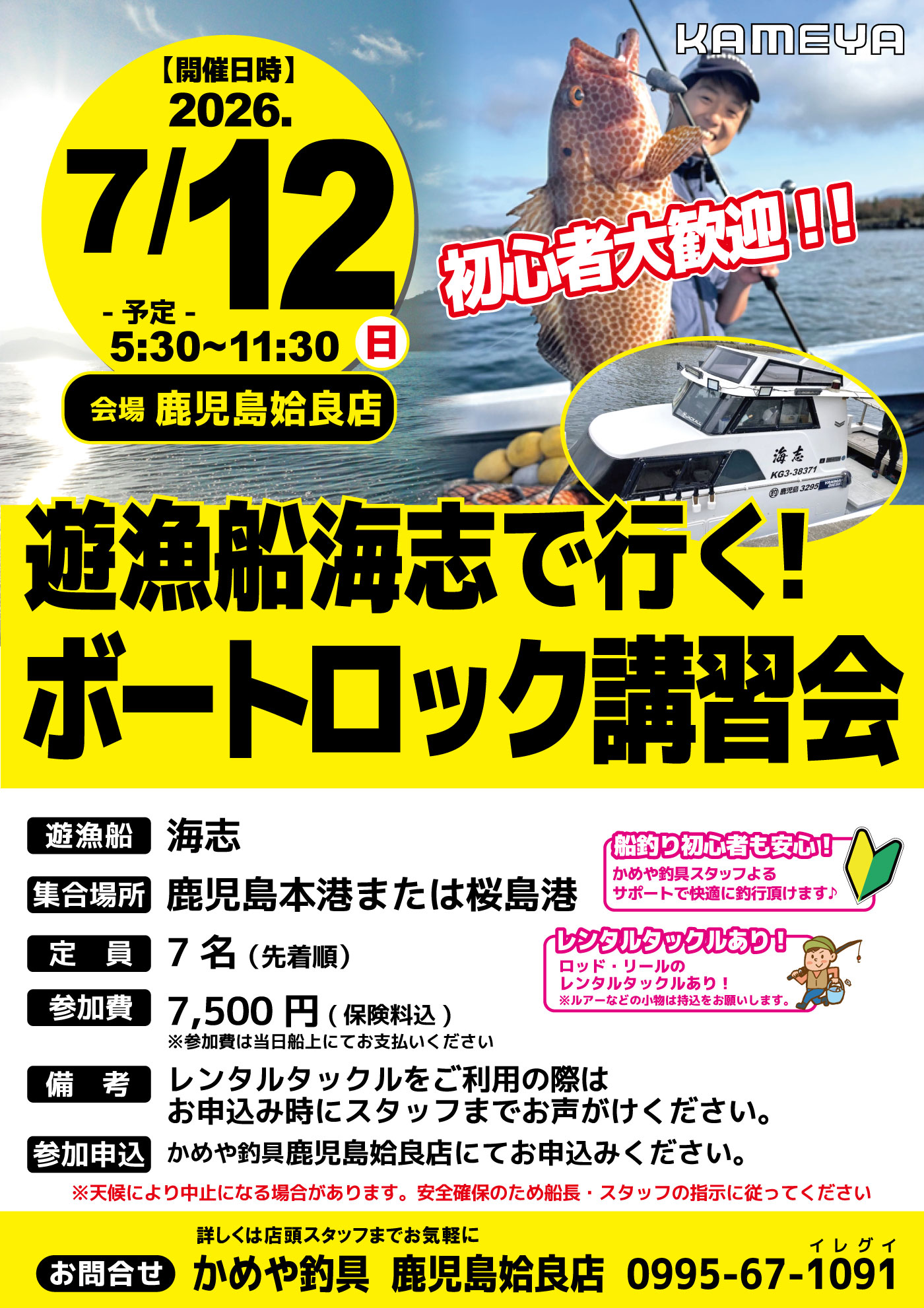 7月122026 【鹿児島姶良店】遊漁船海志で行く!ボートロック講習会 イベント 開催期間 7月12日(日曜日)5:30~11:30 開催場所 鹿児島姶良店 参加費 7,500円 問い合わせ 鹿児島姶良店 TEL.0995-67-1091