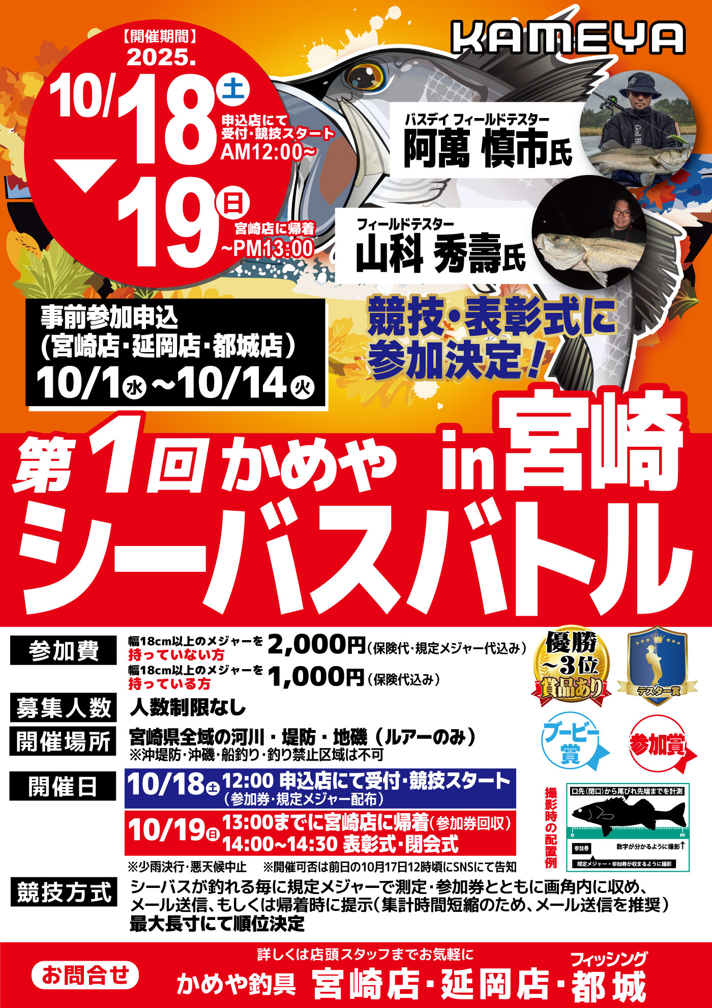 10月192025 【宮崎店】第1回かめやシーバスバトルin宮崎 大会・ダービー 開催期間 10月18日(土曜日)〜10月19日(日曜日) 開催店舗 かめや釣具 宮崎店/延岡店/都城店 参加費 幅18cm以上のメジャーを持っている方1,000円/持っていない方2,000円 問い合わせ 宮崎店 TEL.0985-61-1191 、延岡店 TEL.0982-22-1091 、フィッシング都城店 TEL.0986-46-3255