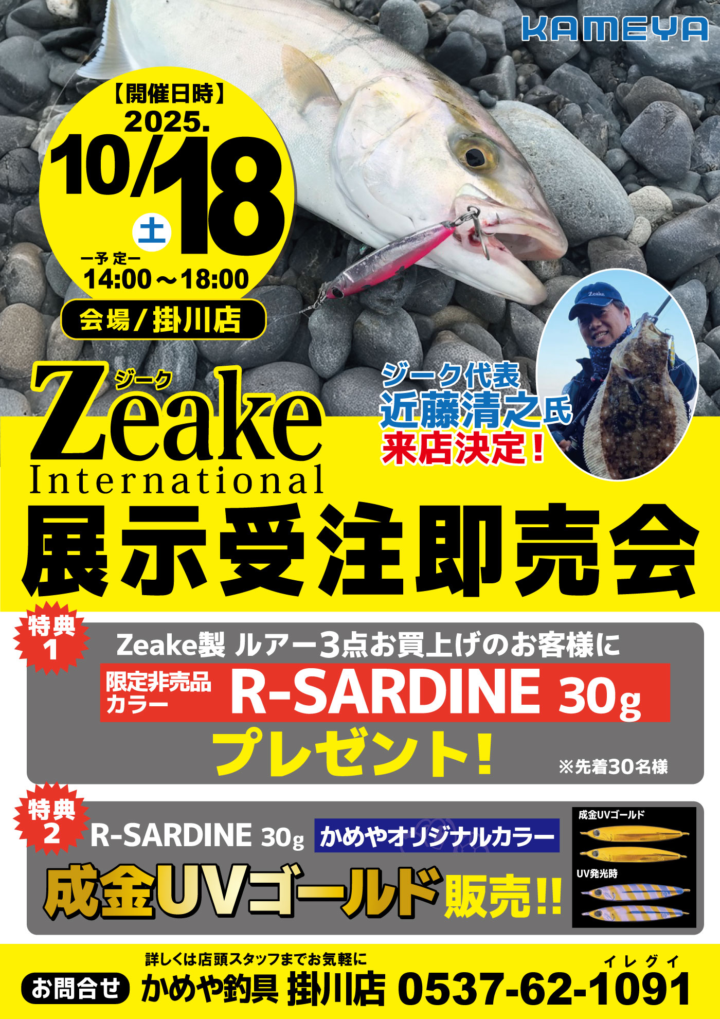 10月182025 【掛川店】Zeake 展示受注即売会 イベント 開催期間 10月18日(土曜日)14:00~18:00 開催場所 かめや釣具 掛川店 参加費 問い合わせ 掛川店 TEL.0537-62-1091