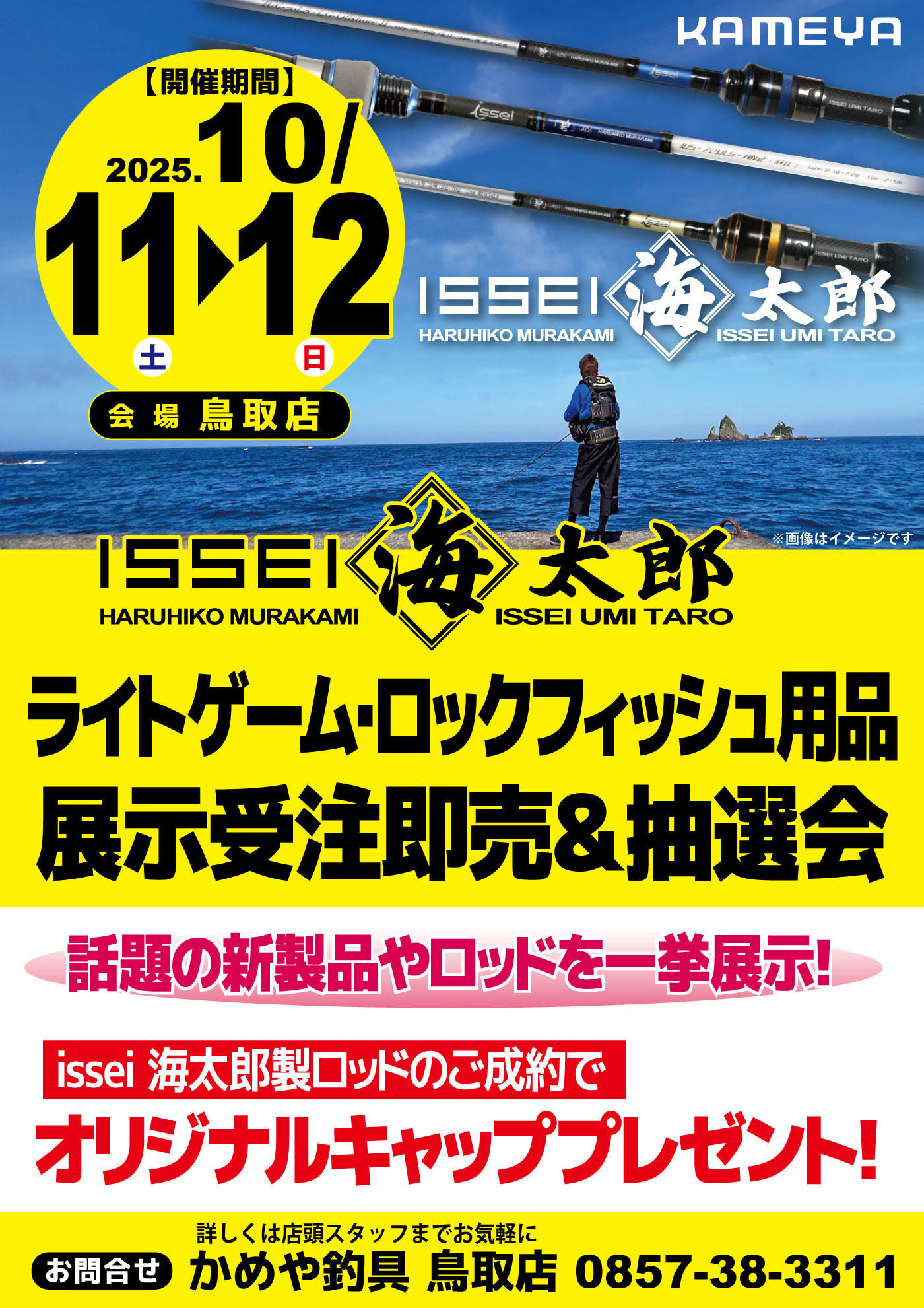 10月122025 【鳥取店】issei 海太郎 ロッド展示イベント イベント 開催期間 10月11日(土曜日)〜10月12日(日曜日) 開催場所 かめや釣具 鳥取店 参加費 問い合わせ 鳥取店 TEL.0857-38-3311