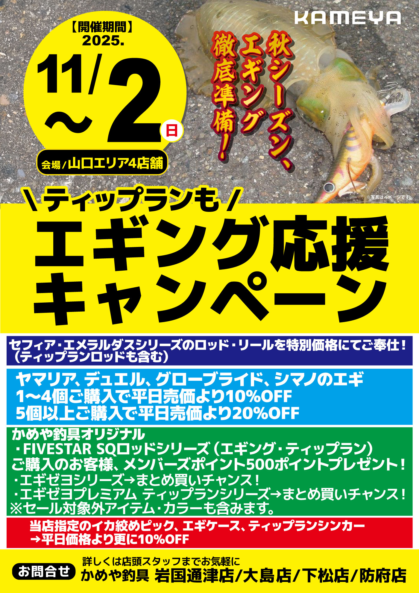 10月312025 【山口エリア4店舗】エギング応援キャンペーン(ティップラン含む) イベント 開催期間 〜11月2日(日曜日) 開催場所 かめや釣具 山口エリア4店舗 参加費 問い合わせ 岩国通津店 TEL.0827-39-1826 、大島店 TEL.0820-79-2626 、下松店 TEL.0833-45-1091 、防府店 TEL.0835-26-6677