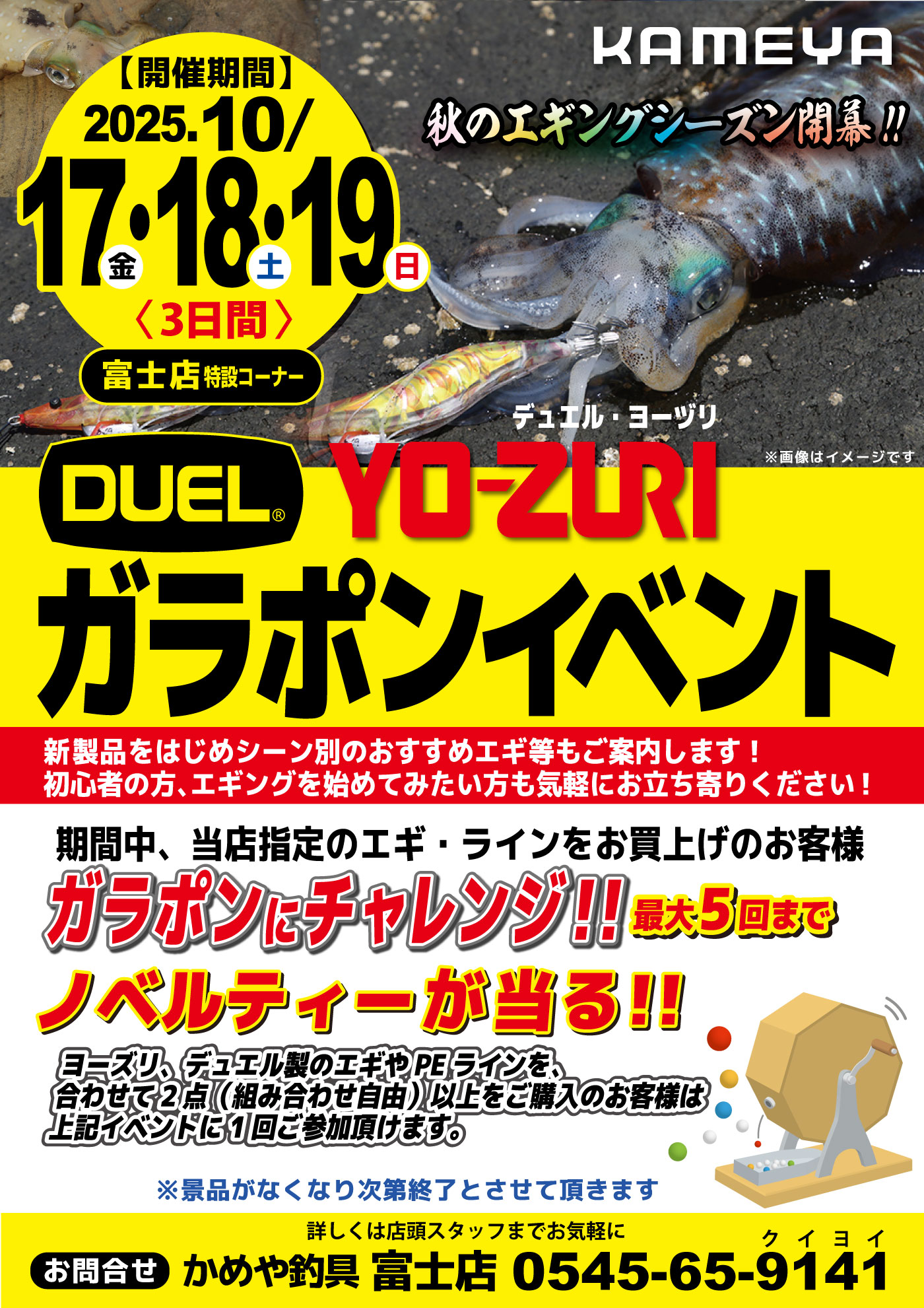 10月192025 【富士店】デュエル ヨーヅリ ガラポンイベント イベント 開催期間 10月17日(金曜日)〜10月19日(日曜日) 開催場所 かめや釣具 富士店 参加費 問い合わせ 富士店 TEL.0545-65-9141