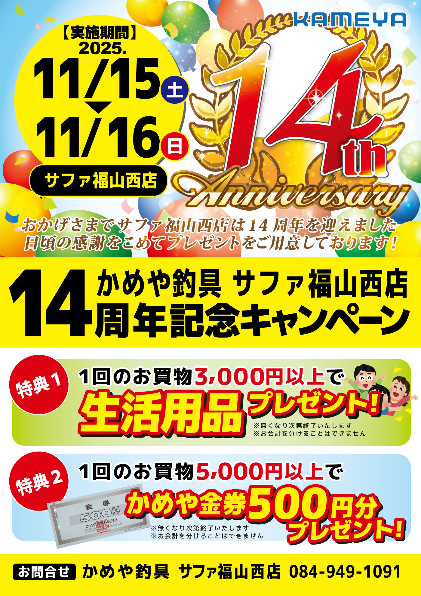 11月162025 【サファ福山西店】14周年記念キャンペーン イベント 開催期間 11月15日(土曜日)〜11月16日(日曜日) 開催場所 かめや釣具 サファ福山西店 参加費 問い合わせ サファ福山西店 TEL.084-949-1091