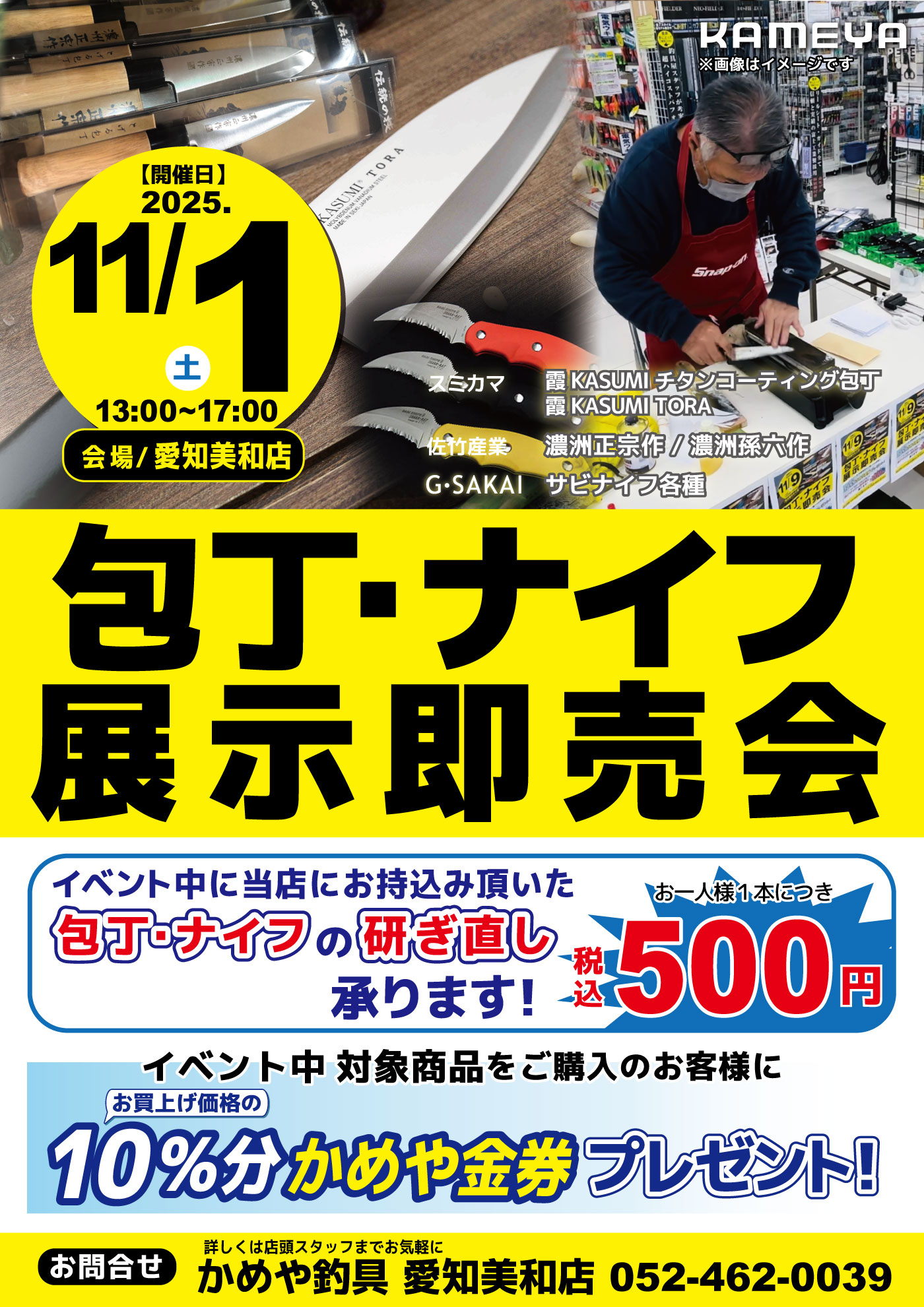 11月012025 【愛知美和店】包丁・ナイフ展示即売会 イベント 開催期間 11月1日(土曜日)13:00~17:00 開催場所 かめや釣具 愛知美和店 参加費 問い合わせ 愛知美和店 TEL.052-462-0039