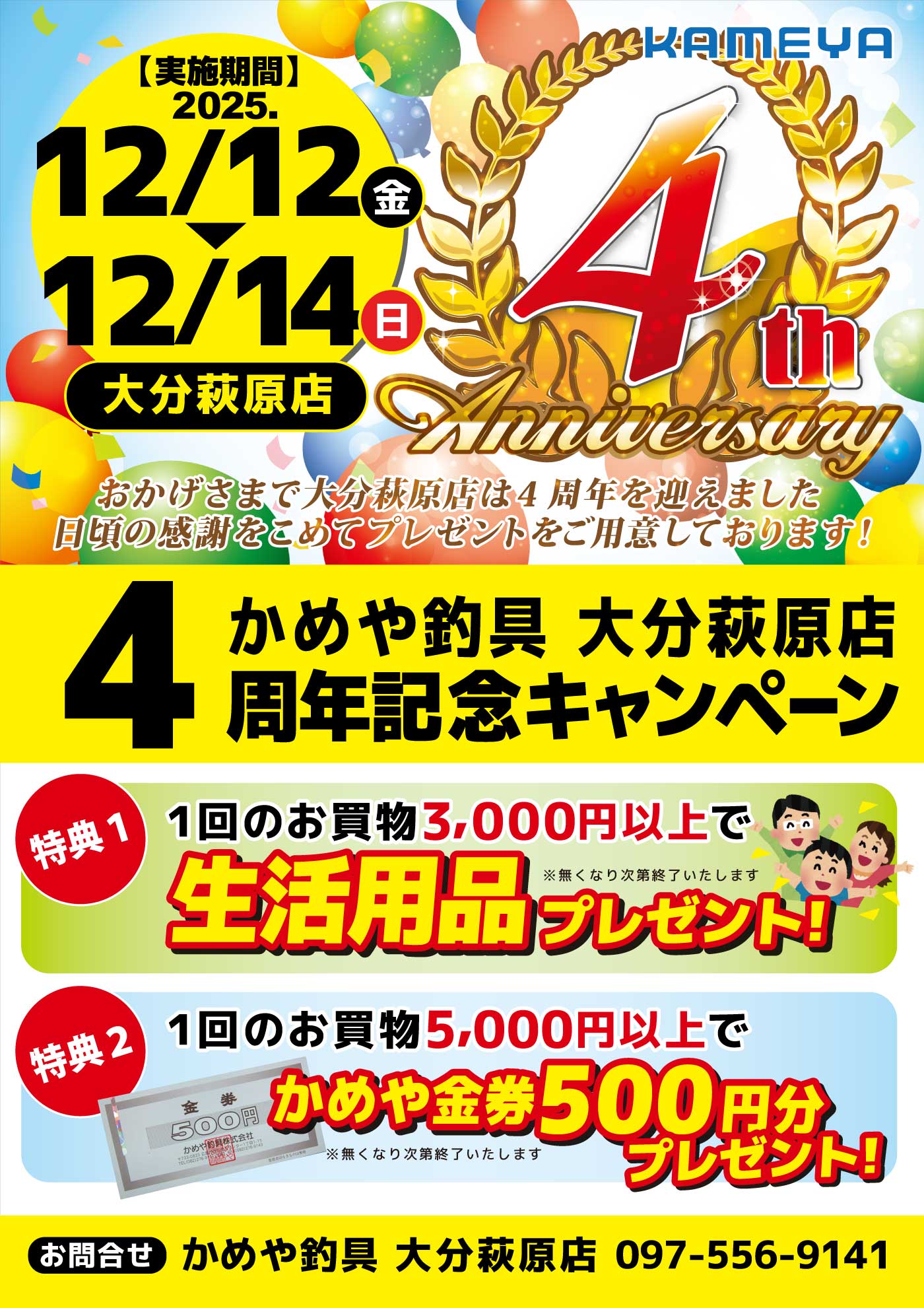12月122025 【大分萩原店】4周年記念キャンペーン 大分萩原店イベント 開催期間 12月12日(金曜日)〜12月14日(日曜日) 開催場所 かめや釣具 大分萩原店 参加費 問い合わせ 大分萩原店 TEL.097-556-9141