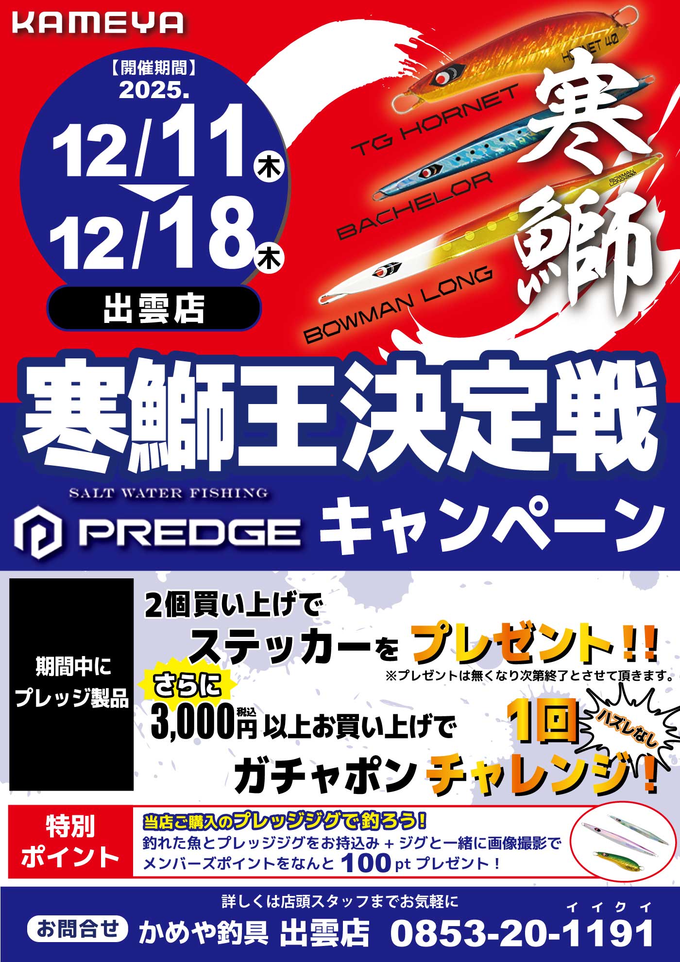 12月112025 【出雲店】寒鰤王決定戦連動イベント プレッジ キャンペーン イベント 開催期間 12月11日(木曜日)〜12月18日(木曜日) 開催場所 かめや釣具 出雲店 参加費 問い合わせ 出雲店 TEL.0853-20-1191