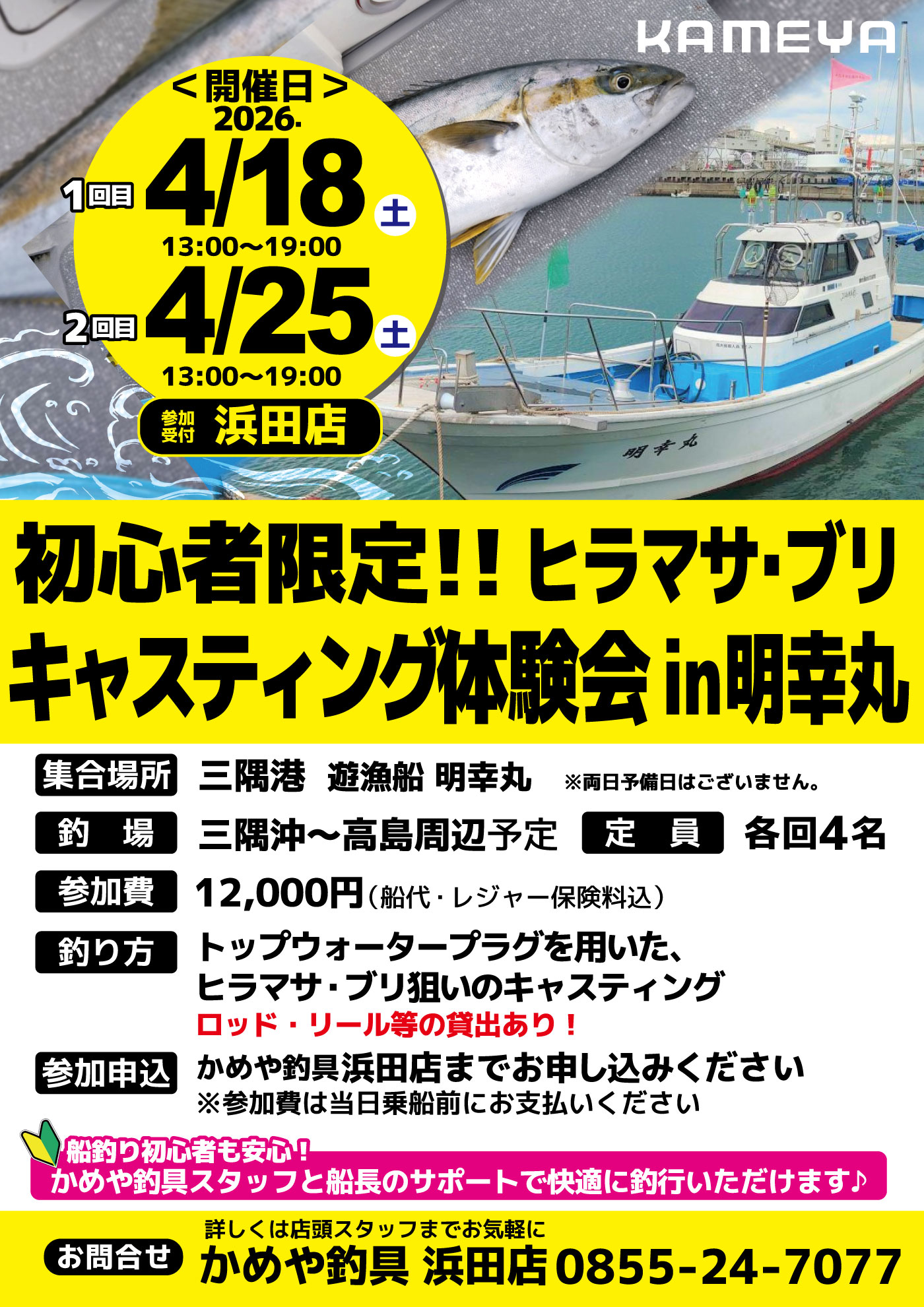 4月182026 【浜田店】初心者限定!!ヒラマサ・ブリ キャスティング体験会 イベント 開催期間 4月18日(土曜日)13:00~19:00 集合場所 三隅港 遊漁船 明幸丸 参加費 12,000円 ※船代・レジャー保険代込 問い合わせ 浜田店 TEL.0855-24-7077