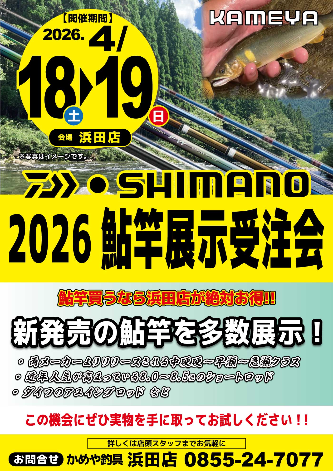4月192026 【浜田店】 2026 鮎竿展示受注会 イベント 開催期間 4月18日(土曜日)〜4月19日(日曜日) 開催場所 かめや釣具 浜田店 参加費 問い合わせ 浜田店 TEL.0855-24-7077