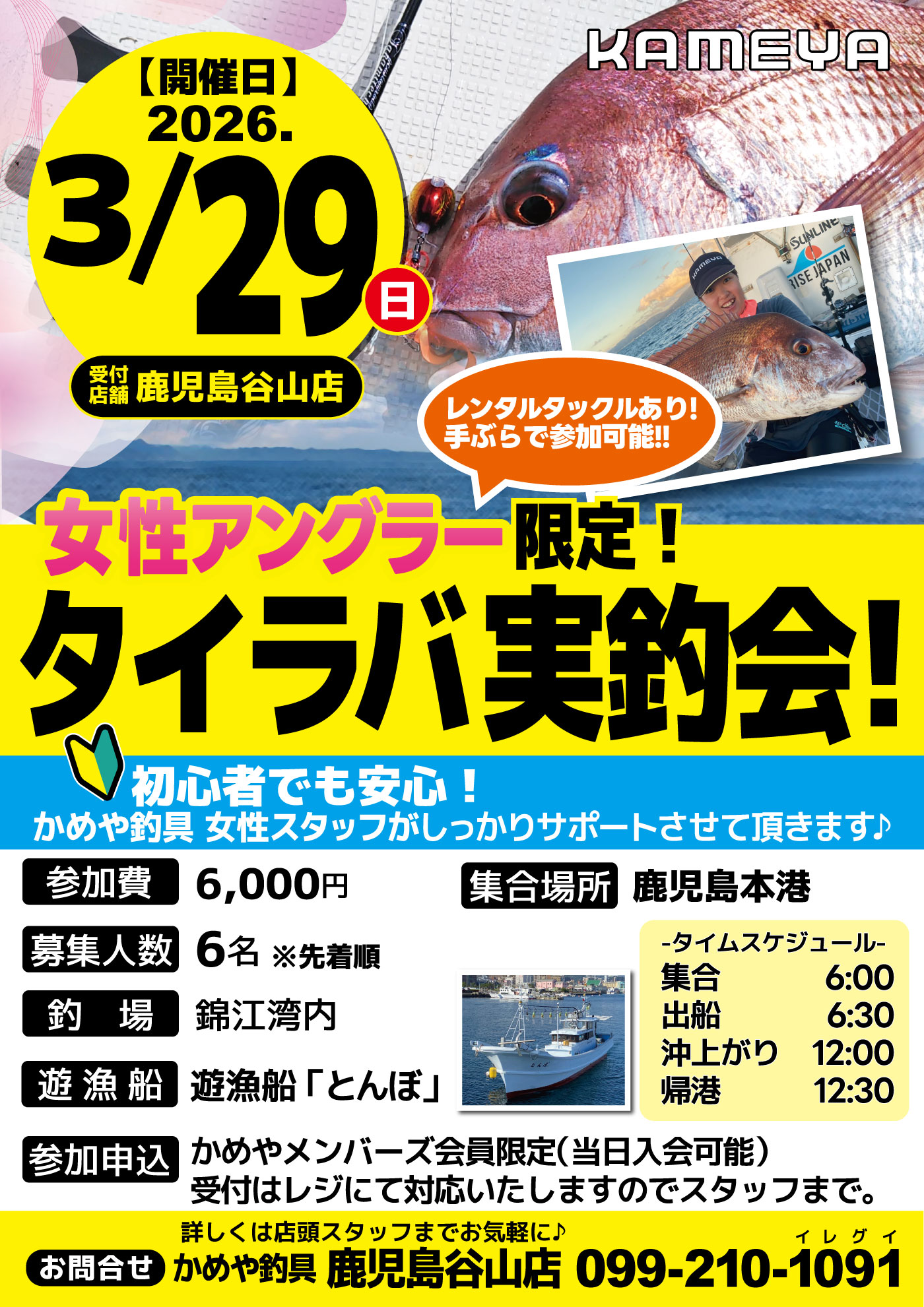 3月292026 【鹿児島谷山店】女性アングラー限定!タイラバ実釣会!! イベント 開催期間 3月29日(日曜日)6:00~12:30 集合場所 鹿児島本港 参加費 6,000円 問い合わせ 鹿児島谷山店 TEL.099-210-1091