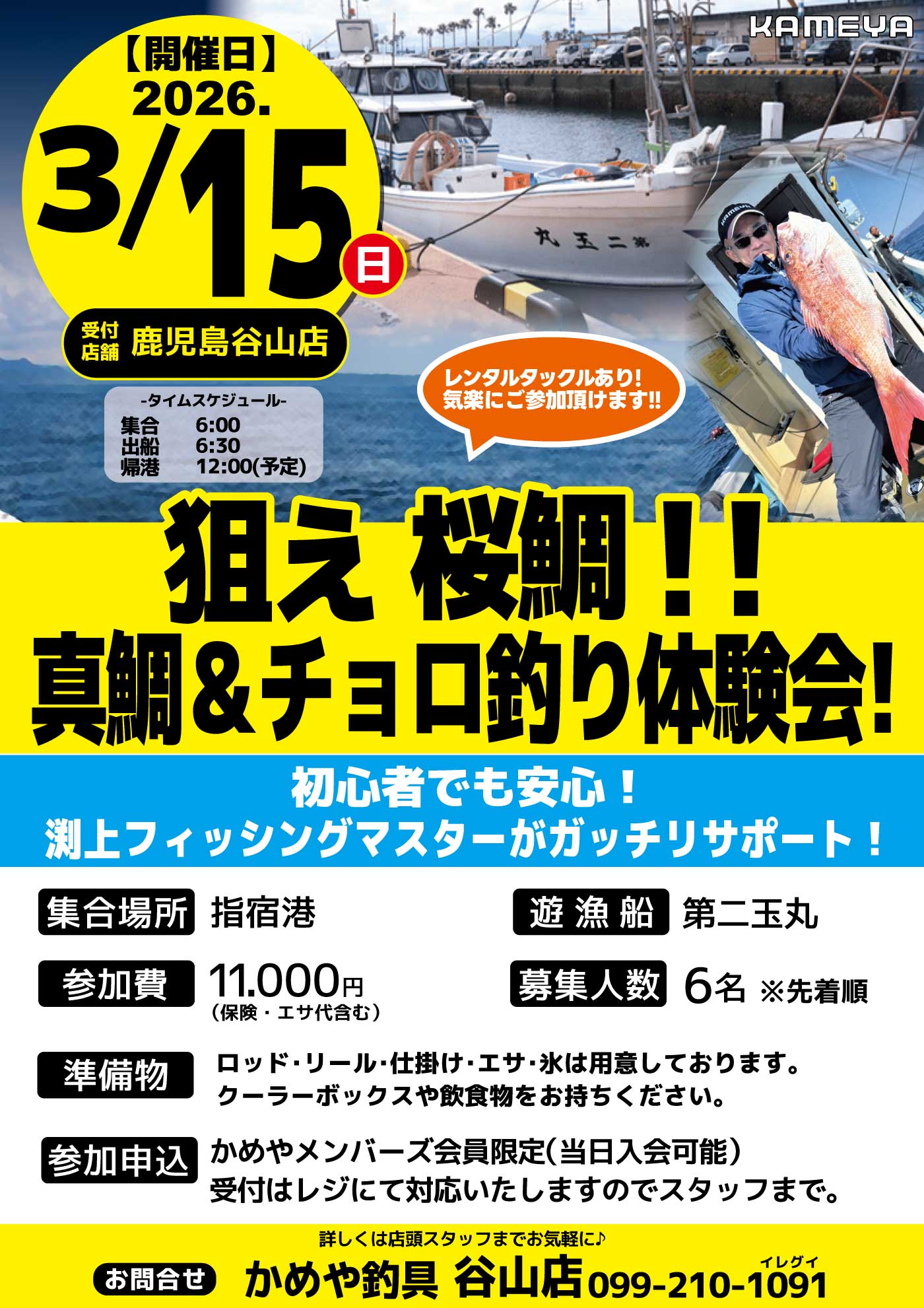 3月152026 【谷山店】狙え、桜鯛!真鯛コマセ&チョロ釣り体験会 イベント 開催期間 3月15日(日曜日)6:00~12:00〜3月15日(日曜日) 開催場所 かめや釣具 谷山店 参加費 11.000円 問い合わせ 鹿児島谷山店 TEL.099-210-1091