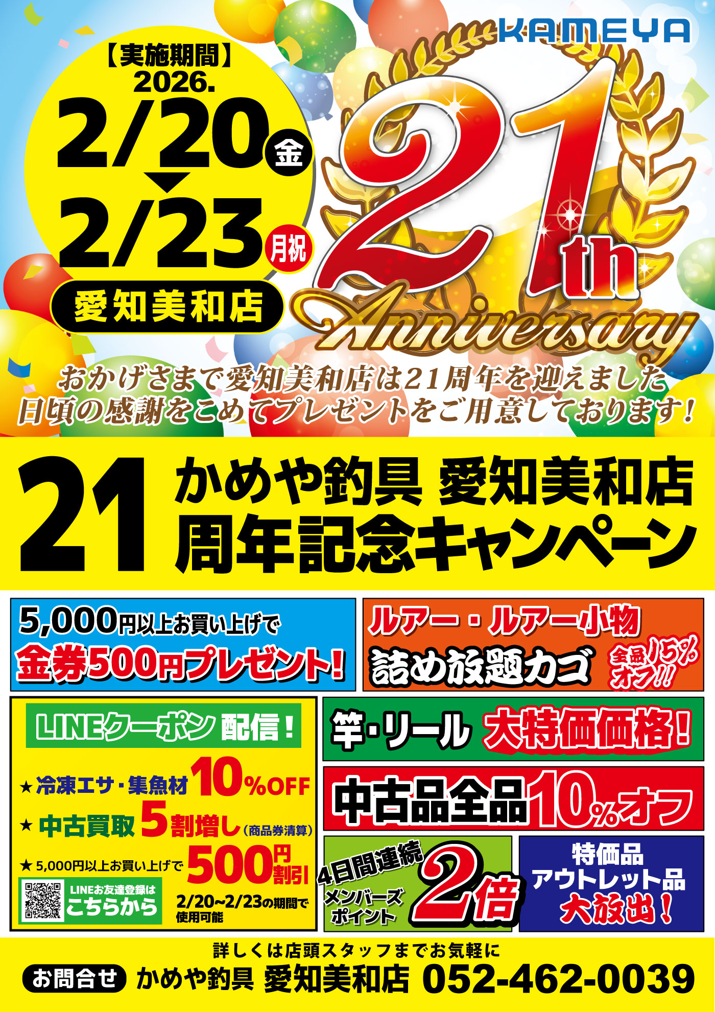 2月202026 【愛知美和店】オープン21周年記念イベント イベント 開催期間 2月20日(金曜日)〜2月23日(月曜日) 開催場所 かめや釣具 愛知美和店 参加費 問い合わせ 愛知美和店 TEL.052-462-0039