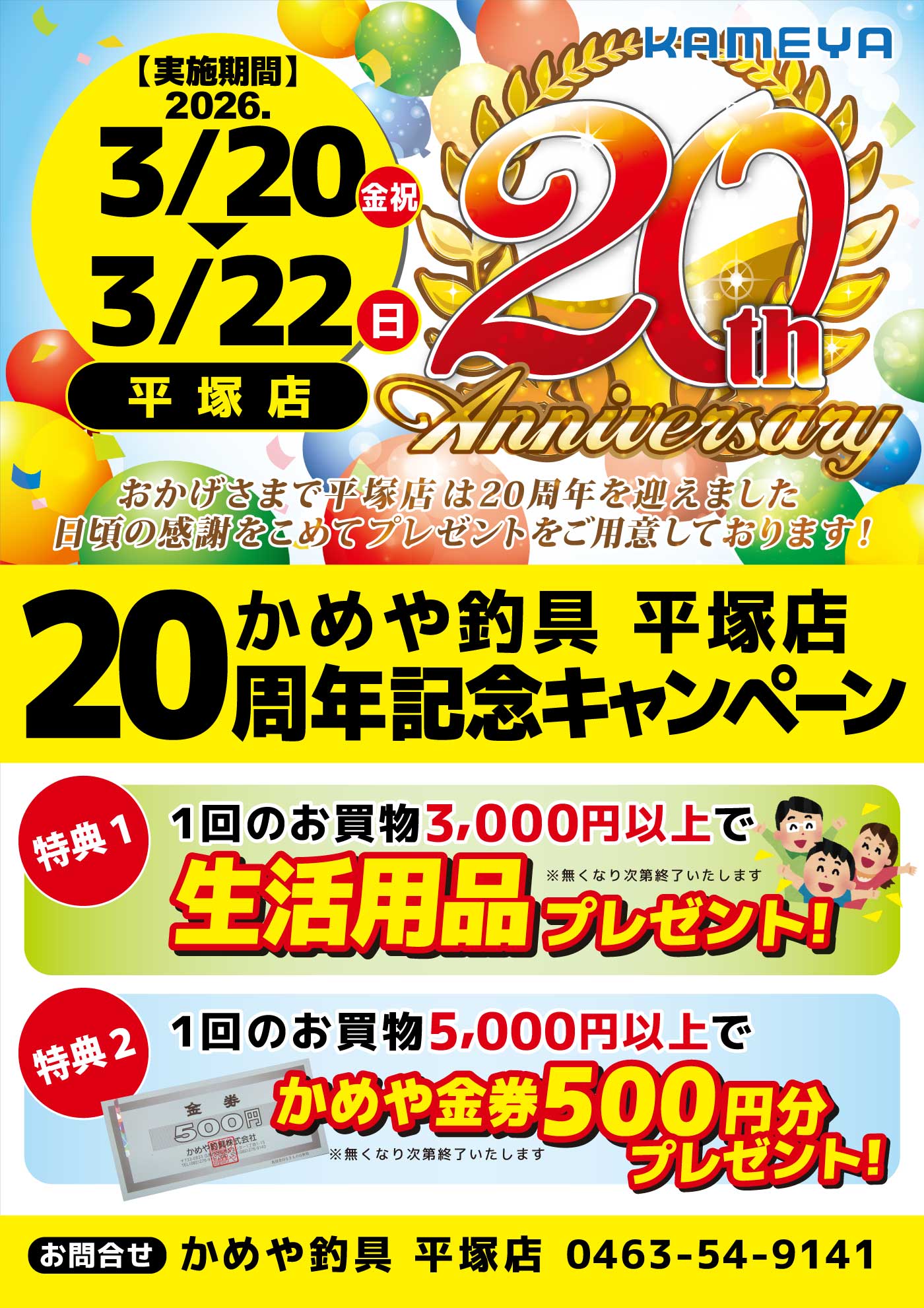3月222026 【平塚店】オープン20周年記念イベント イベント 開催期間 3月20日(金曜日)〜3月22日(日曜日) 開催場所 かめや釣具 平塚店 参加費 問い合わせ 平塚店 TEL.0463-54-9141