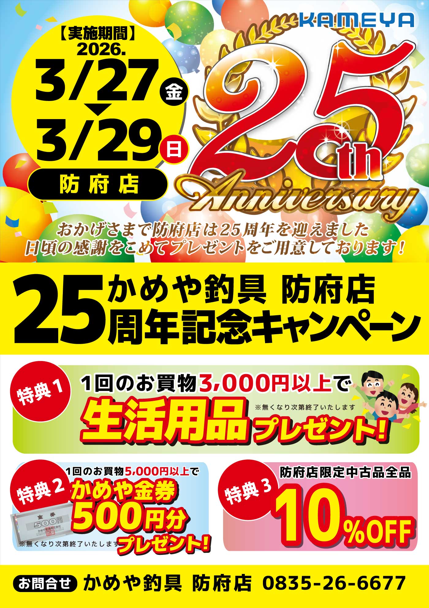 3月292026 【防府店】オープン25周年記念イベント イベント 開催期間 3月27日(金曜日)〜3月29日(日曜日) 開催場所 かめや釣具 防府店 参加費 問い合わせ 防府店 TEL.0835-26-6677