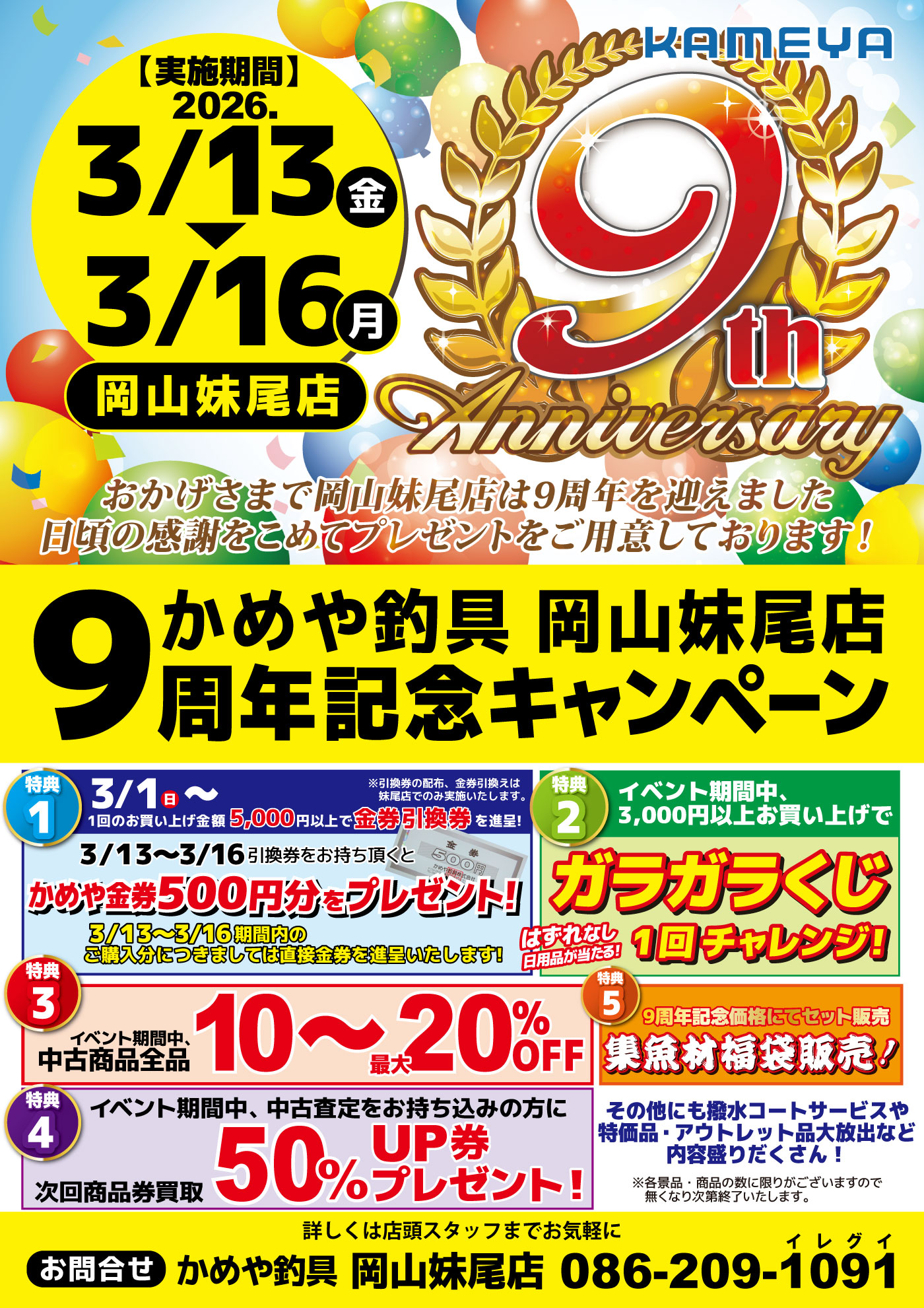 3月132026 【岡山妹尾店】オープン9周年記念イベント イベント 開催期間 3月13日(金曜日)〜3月16日(月曜日) 開催場所 かめや釣具 岡山妹尾店 参加費 問い合わせ 岡山妹尾店 TEL.086-209-1091