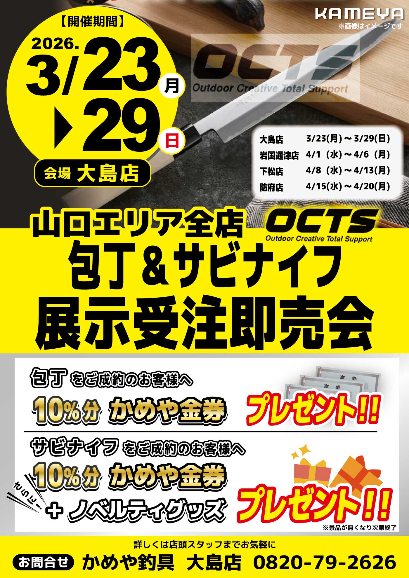 3月232026 【大島店】山口エリア全店 包丁&サビナイフ展示受注即売会 イベント 開催期間 3月23日(月曜日)〜3月29日(日曜日) 開催場所 かめや釣具 大島店 参加費 問い合わせ 大島店 TEL.0820-79-2626
