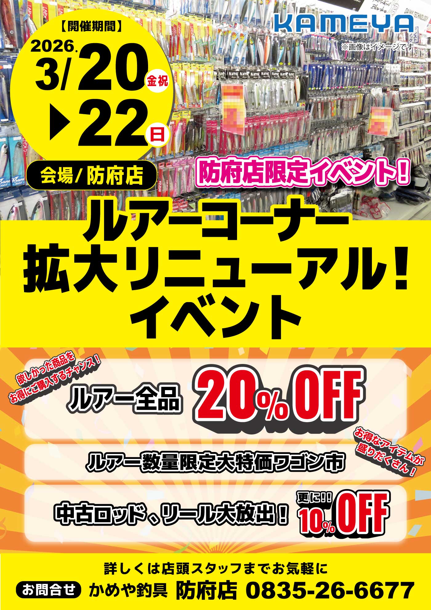 3月222026 【防府店】ルアーコーナー拡大リニューアル!イベント イベント 開催期間 3月20日(金曜日)〜3月22日(日曜日) 開催場所 かめや釣具 防府店 参加費 問い合わせ 防府店 TEL.0835-26-6677
