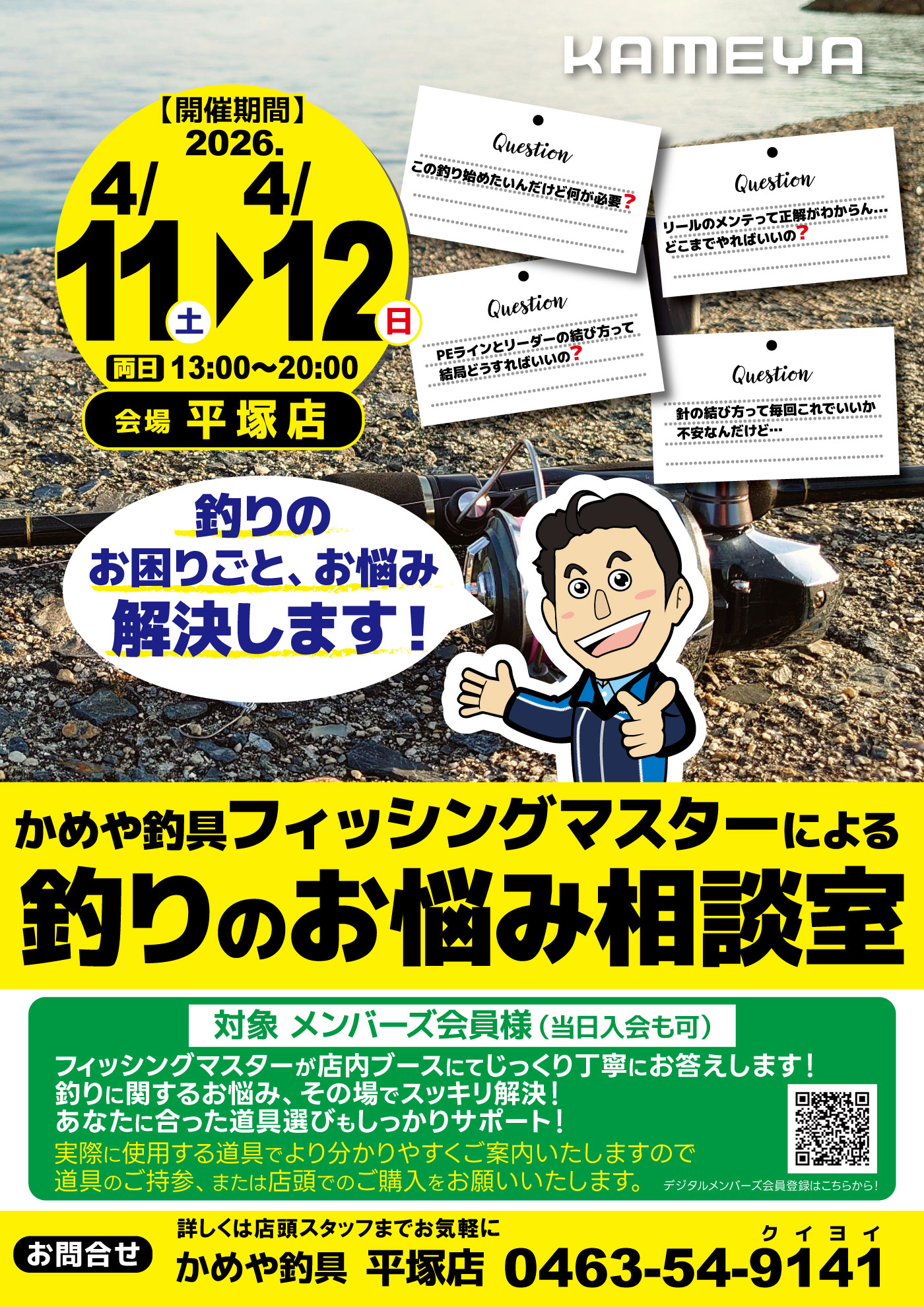 4月112026 【平塚店】釣りのお悩み相談室 イベント 開催期間 4月11日(土曜日)13:00~20:00〜4月12日(日曜日) 開催場所 かめや釣具 平塚店 参加費 問い合わせ 平塚店 TEL.0463-54-9141