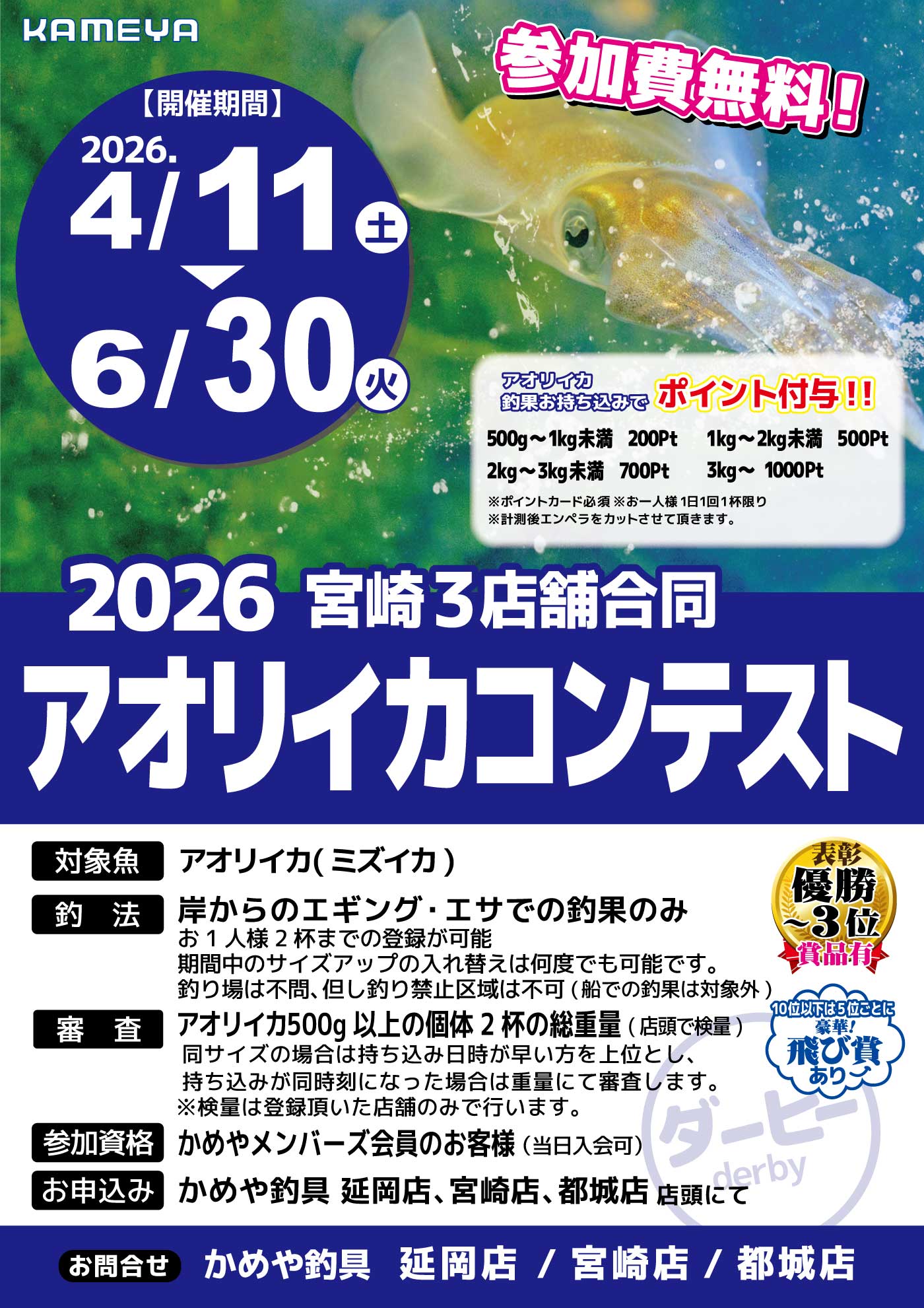 4月112026 【宮崎エリア3店舗】アオリイカコンテスト 2026 大会・ダービー 開催期間 4月11日(土曜日)〜6月30日(火曜日) 開催場所 かめや釣具 延岡店/宮崎店/都城店 参加費 問い合わせ 延岡店 TEL.0982-22-1091 、フィッシング都城店 TEL.0986-46-3255 、宮崎店 TEL.0985-61-1191