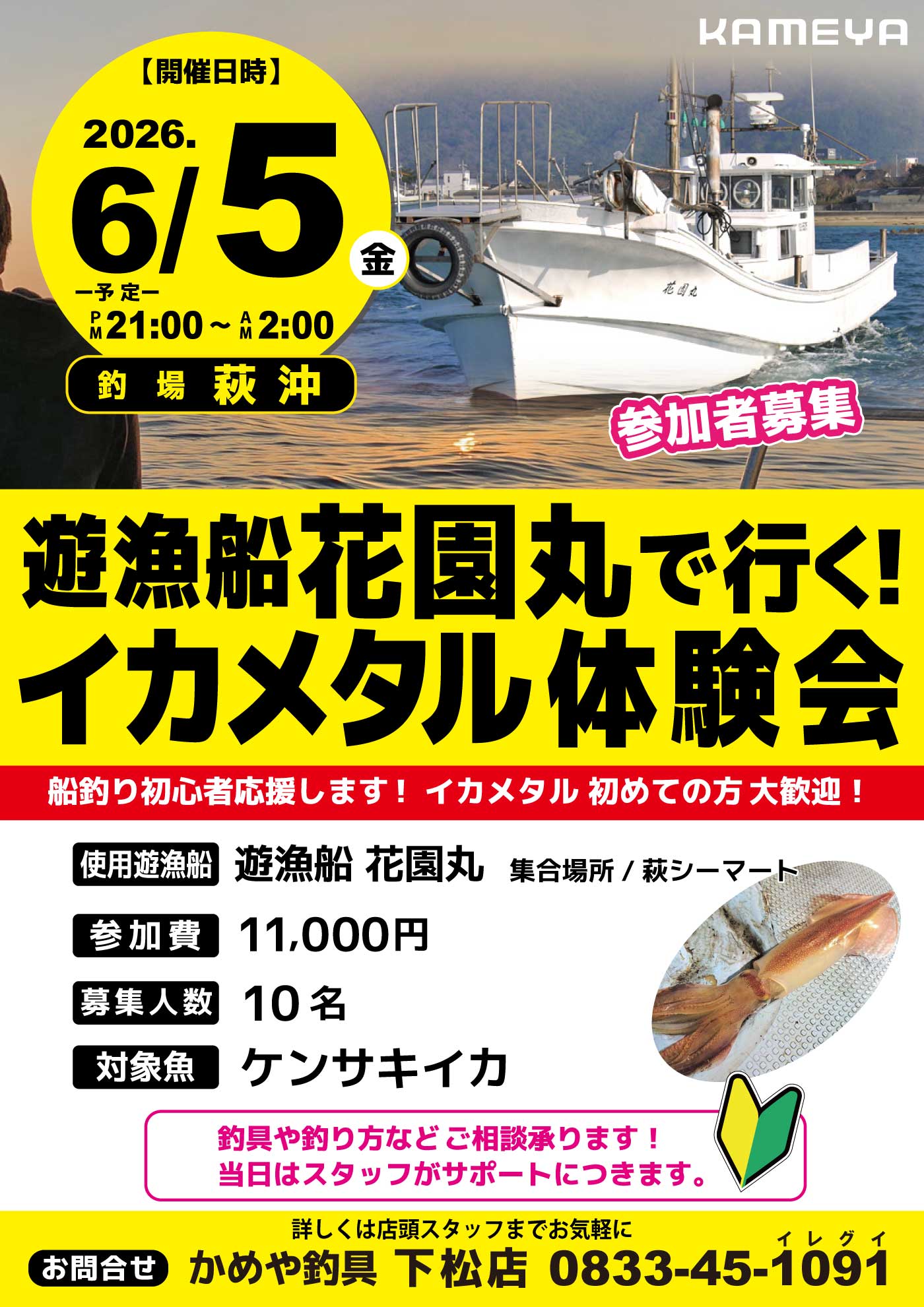 6月052026 【下松店】遊漁船 花園丸で行く!イカメタル体験会 イベント 開催期間 6月5日(金曜日)21:00~2:00 開催場所 かめや釣具 下松店 参加費 11,000円 問い合わせ 下松店 TEL.0833-45-1091