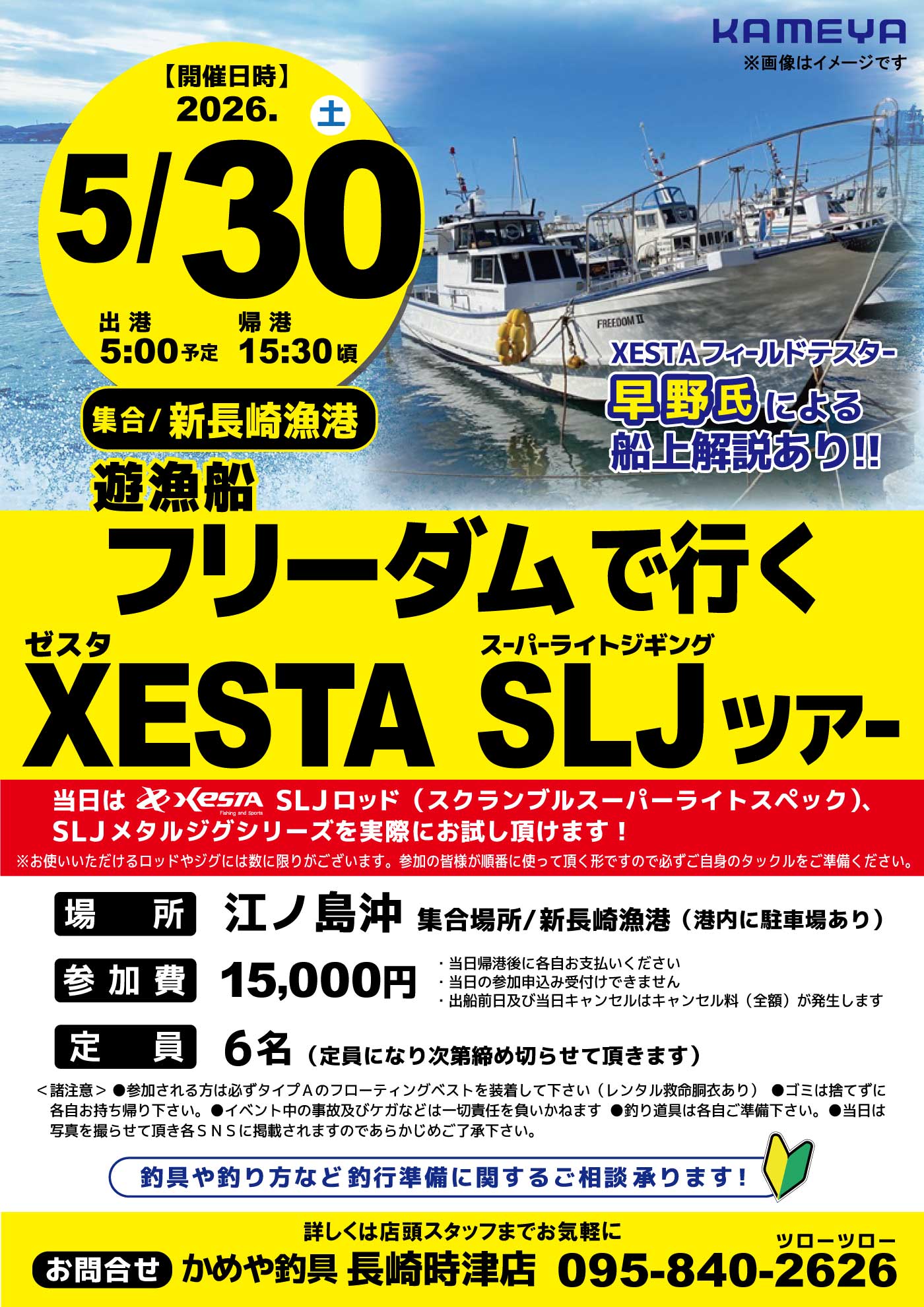 5月302026 【長崎時津店】遊漁船フリーダムでいく! XESTA SLJツアー イベント 開催期間 5月30日(土曜日)5:00~15:30 集合場所 新長崎漁港 参加費 15,000円 問い合わせ 長崎時津店 TEL.095-840-2626