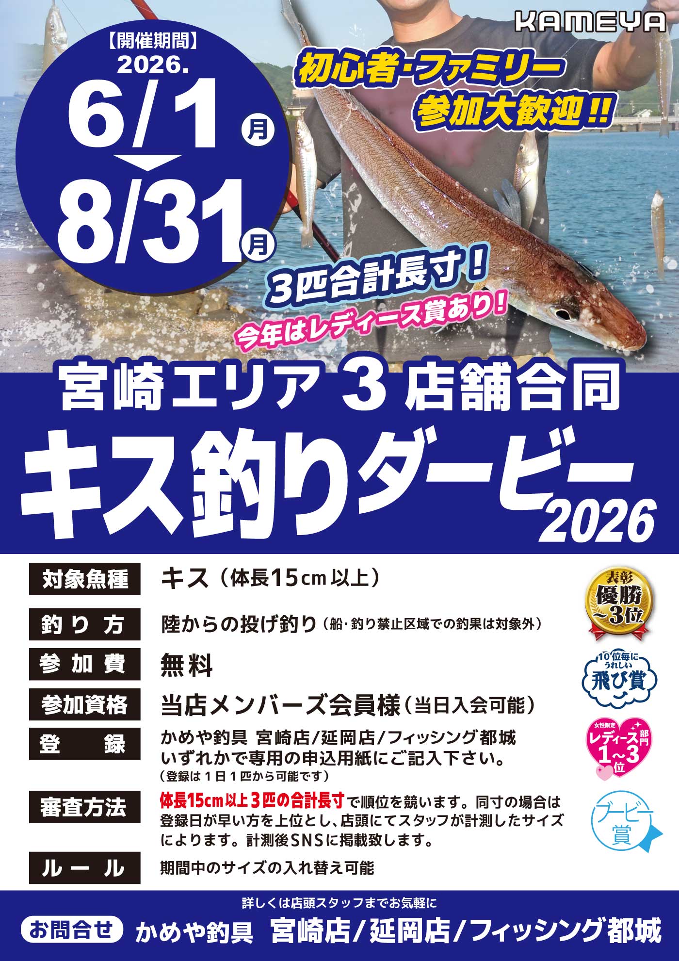 6月012026 【宮崎エリア】3店舗合同 キス釣りダービー 2026 大会・ダービー 開催期間 6月1日(月曜日)〜8月31日(月曜日) 開催場所 かめや釣具 宮崎店 参加費 問い合わせ 宮崎店 TEL.0985-61-1191 、延岡店 TEL.0982-22-1091 、フィッシング都城店 TEL.0986-46-3255