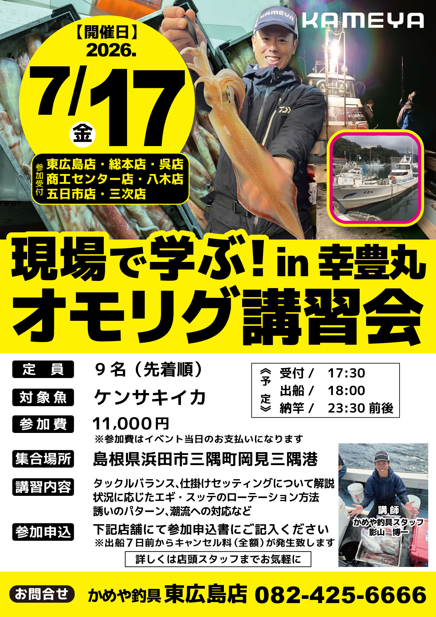 7月172026 【東広島店】現場で学ぶ!オモリグ講習会in幸豊丸 イベント 開催期間 7月17日(金曜日)17:30~23:30 集合場所 浜田市三隅町岡見三隅港 参加費 11,000円 問い合わせ 東広島店 TEL.082-425-6666